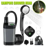 Portable camping shower with 6000mAh rechargeable battery for extended outdoor use. Features 4 adjustable spray modes for versatile water flow control. Lightweight plastic construction ensures durability and easy transport. Ideal for camping, hiking, travel, and emergency use with quick setup and convenient operation.