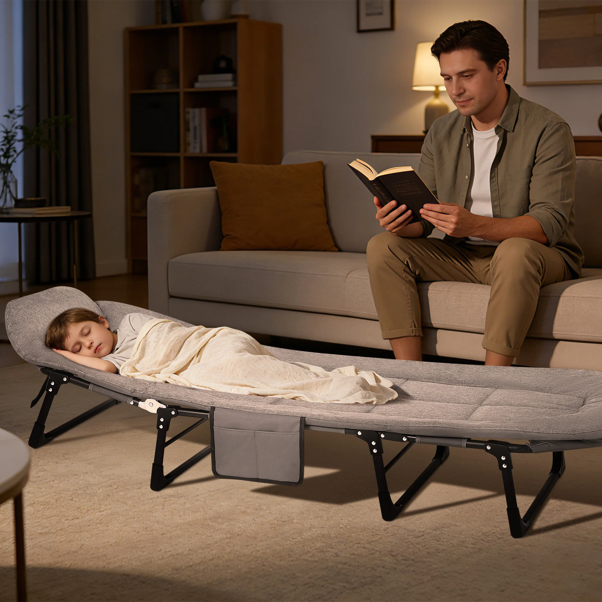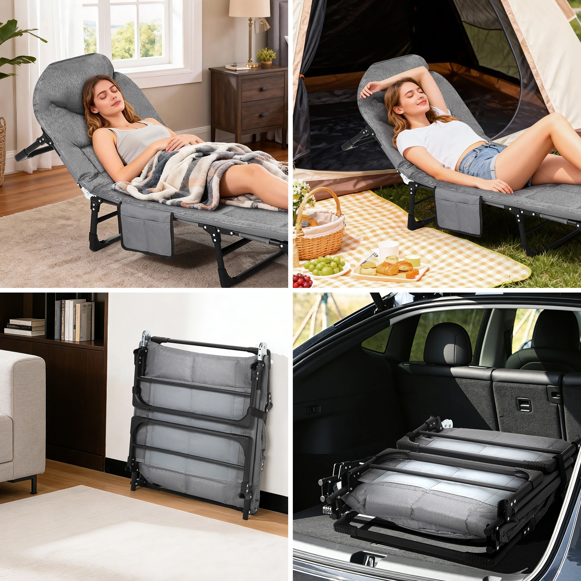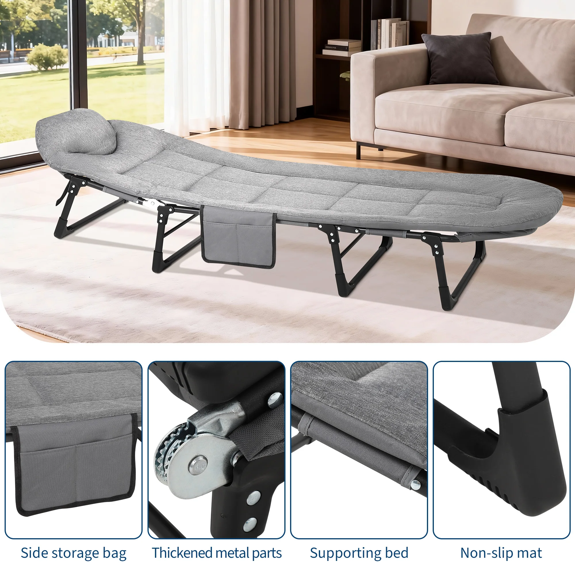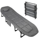 Portable Folding Tent Cot with Cushion Pillow – All-season folding cot with cushioned polyester fill and Oxford seat material. Sturdy carbon steel frame ensures durability, while compact, foldable design allows easy transport and storage. Assembly not required, ideal for camping, hiking, or emergency use.